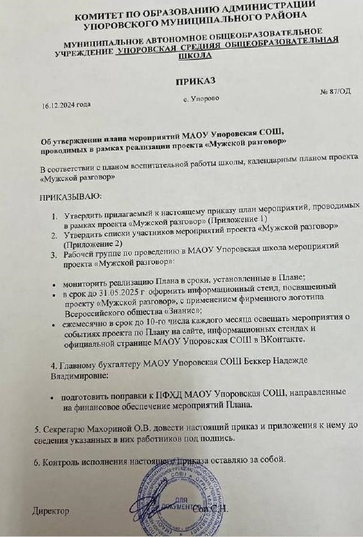 Приказ МАОУ Упоровская СОШ №87/ОД от 16.12.2024г. "Об утверждении плана мероприятий МАОУ Упоровская СОШ, проводимых в рамках реализации проекта "Мужской разговор" Скачать/посмотреть